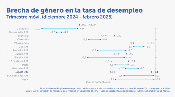 En el trimestre enero – marzo de 2025, el desempleo de los jóvenes disminuyó 3,2 (p.p.) Destacados: En el trimestre enero – marzo de 2025, la tasa de desempleo de los hombres disminuyó 1,7 p.p., mientras