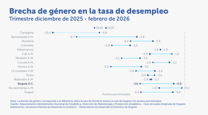 La tasa de desempleo en Bogotá disminuyó 1,8 p.p. en el trimestre móvil noviembre 2025 – enero 2026 Destacados: La población ocupada de Bogotá aumentó 109.161 personas durante el trimestre móvil noviembre de 2025 – enero de 2026