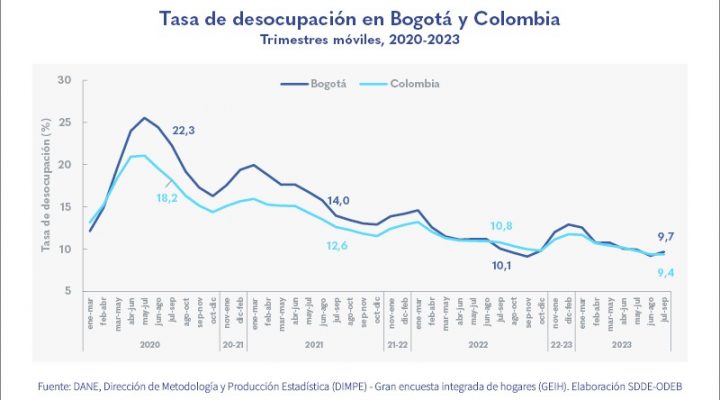 La tasa de desocupación de Bogotá en el trimestre julio-septiembre fue de 9,7 %, la más baja en este trimestre desde 2018 Destacados: La tasa de ocupación (TO) aumentó 3,8 puntos porcentuales (p.p.) con relación al mismo periodo del año anterior. Esto equivalió