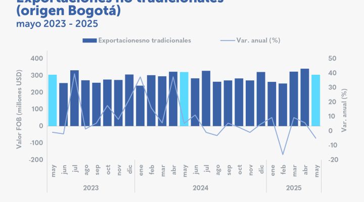 Exportaciones no tradicionales de Bogotá disminuyeron 6,5 % en julio de 2025 Destacados: Las exportaciones no tradicionales1 en julio de 2025 fueron de US$ 306,9 millones, lo que representó 66,1 % del