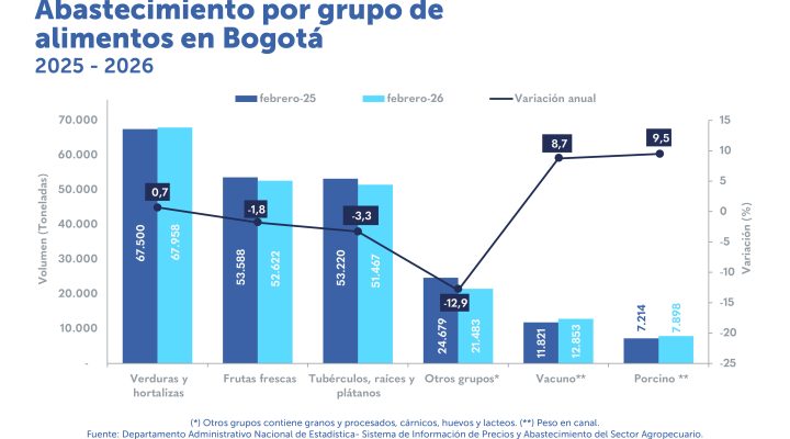En febrero de 2026, el abastecimiento en Bogotá disminuyó 2,7 % Destacados: En Bogotá el abastecimiento de alimentos alcanzó 193.531 toneladas (ton) en febrero de 2026 representando un descenso de 2,7