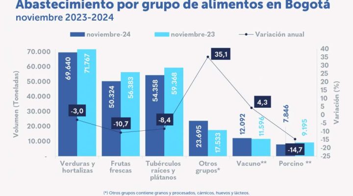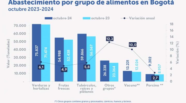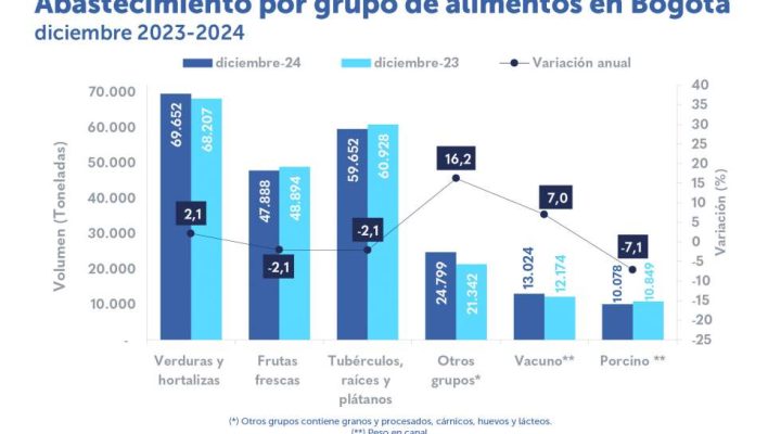 Abastecimiento en Bogotá creció 2,6 % al cierre de 2024. Destacados: En 2024, el abastecimiento per cápita alcanzó 30,3 kilogramos por habitante (kg/hab) en Bogotá y aumentó 1,8 % frente a