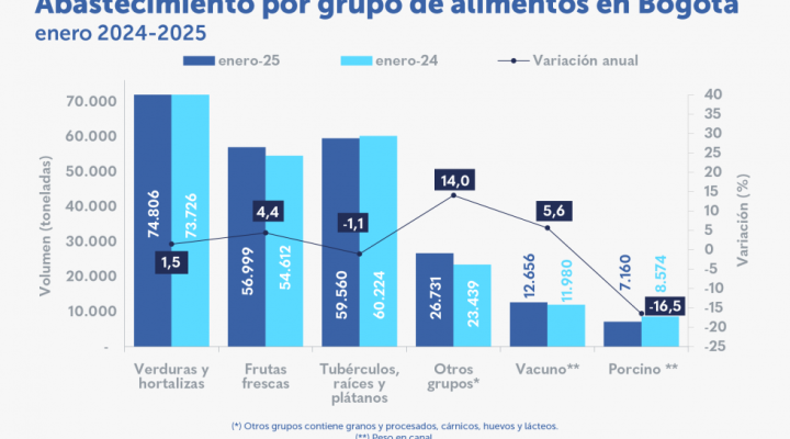 Abastecimiento en Bogotá creció 2,3 % en enero de 2025 Destacados: En 2024, el abastecimiento per cápita alcanzó 30,3 kilogramos por habitante (kg/hab) en Bogotá y aumentó 1,8 % frente a