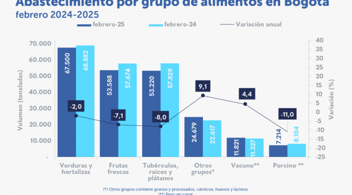 Abastecimiento de alimentos en Bogotá decreció 3,7 % en febrero de 2025 frente al mismo mes de 2024 Destacados: En febrero de 2025, el abastecimiento per cápita alcanzó 27,5 kilogramos por habitante (kg/hab) en Bogotá y bajó 3,8 %