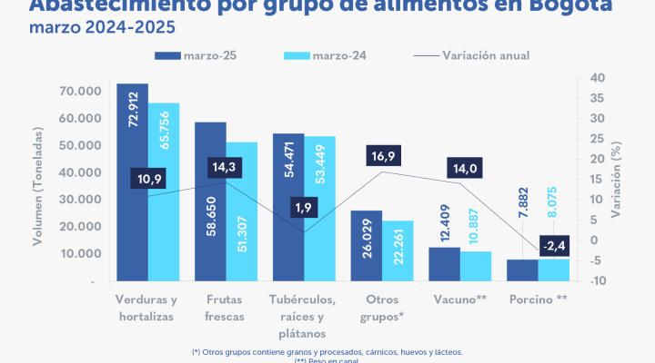 En marzo de 2025, aumentó 9,7 % el abastecimiento de la ciudad Destacados: En marzo de 2025, el abastecimiento per cápita de alimentos en Bogotá fue de 29,3 kilogramos por habitante (kg/hab),