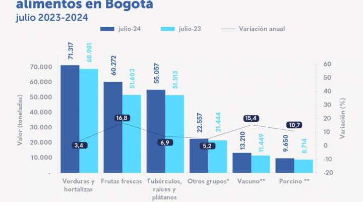 En julio de 2024 el abastecimiento de alimentos de la ciudad aumentó en 8,6 % Destacados: En julio de 2024, el abastecimiento per cápita alcanzó 28,9 kilogramos por habitante (kg/hab) en Bogotá aumentando 7,7 % frente a