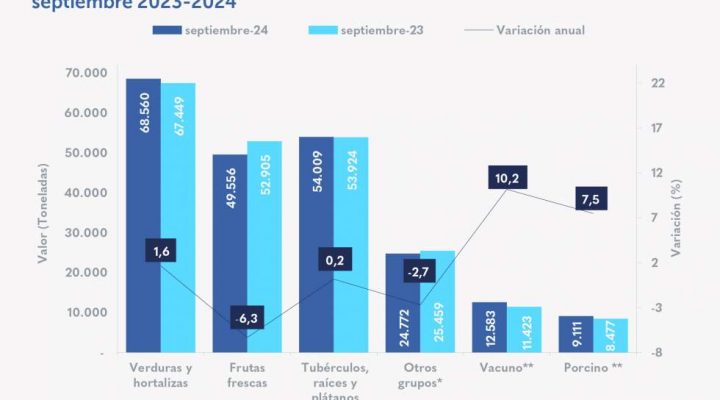 El abastecimiento de alimentos en Bogotá alcanzó 218.591 toneladas en septiembre de 2024 Destacados: El sacrificio de ganado porcino y vacuno en septiembre de 2024 fue de 21.694 toneladas (ton) de carne en canal, reflejando una