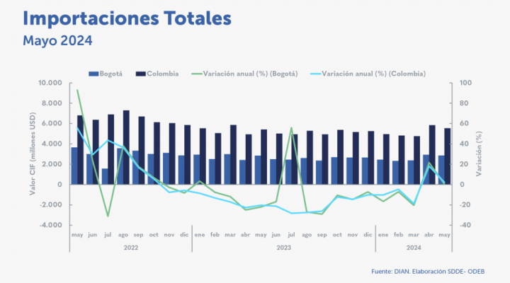 Las importaciones de Bogotá aumentaron 21,5 % en abril de 2024 Destacados: Las importaciones de bienes primarios en abril de 2024 registraron un aumento anual de 41,6 % y las de manufacturas crecieron 19,4