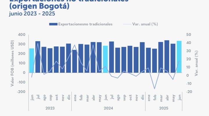 Exportaciones no tradicionales de Bogotá aumentaron 17,9 % en junio de 2025 Destacados: Las exportaciones no tradicionales1 en junio de 2025 fueron de US$ US$ 334,3 millones, lo que representó 73,2 %