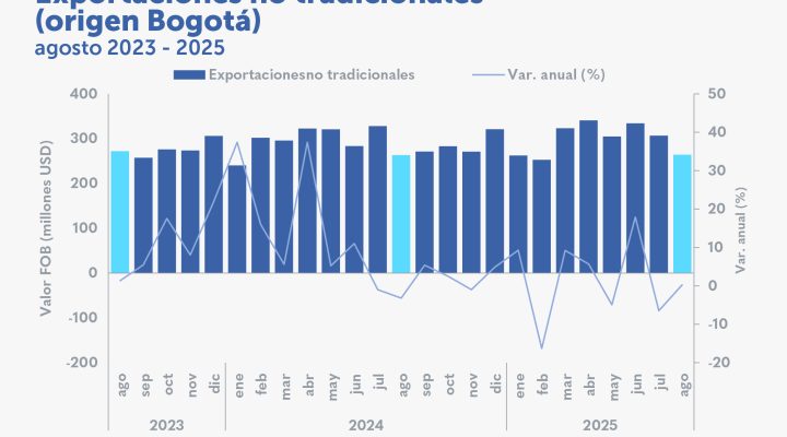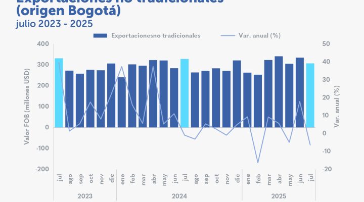 Exportaciones no tradicionales de Bogotá disminuyeron 6,5 % en julio de 2025 Destacados: Las exportaciones no tradicionales1 en julio de 2025 fueron de US$ 306,9 millones, lo que representó 66,1 % del