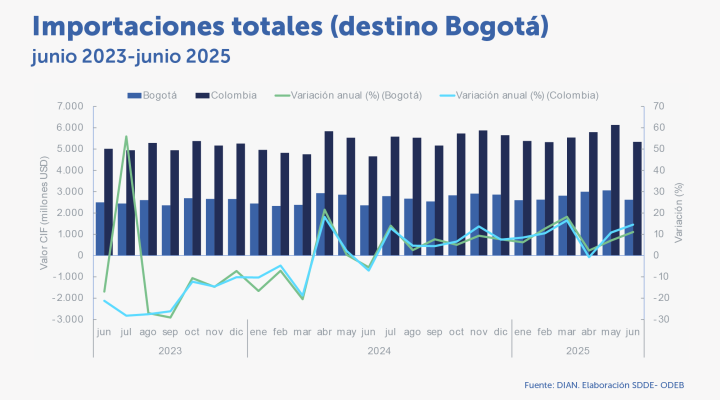 Las importaciones de Bogotá crecieron 11,1 % en junio de 2025 Destacados: Las importaciones de manufacturas registraron un incremento anual de 13,4 %, mientras que los bienes primarios disminuyeron 23,2 % en