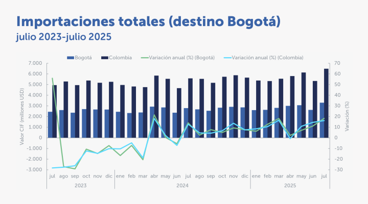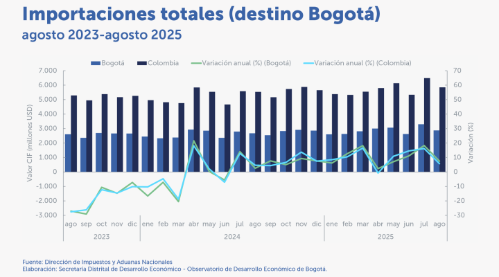 Las importaciones de Bogotá aumentaron 7,5% en agosto de 2025 Destacados: Las importaciones de manufacturas registraron un incremento anual de 7,7 %, mientras que los bienes primarios disminuyeron 2,0 %