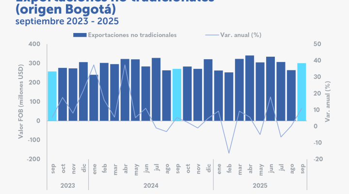 Exportaciones no tradicionales de Bogotá aumentaron 10,8 % en septiembre de 2025 Destacados: Las exportaciones no tradicionales1 en septiembre de 2025 fueron de US$300,6 millones, lo que representó 54,2 % del total