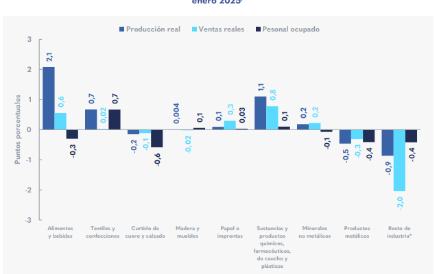 En enero de 2025, la producción real en Bogotá creció 2,6 % Destacados: Las ventas reales de los alimentos y bebidas en Bogotá aumentaron 2,0 % con respecto a enero de 2024 y aportaron 0,6 puntos porcentuales (p.p.)