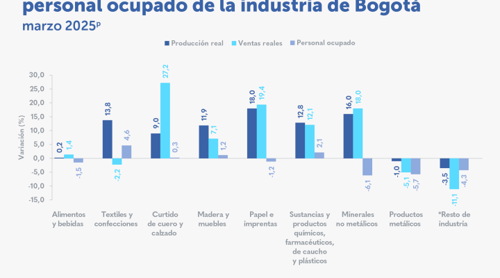 En marzo de 2025, mejoró el desempeño de la industria en Bogotá. Destacados: En marzo de 2025, la producción real de la industria creció 6,8 % en Bogotá. El personal ocupado en el