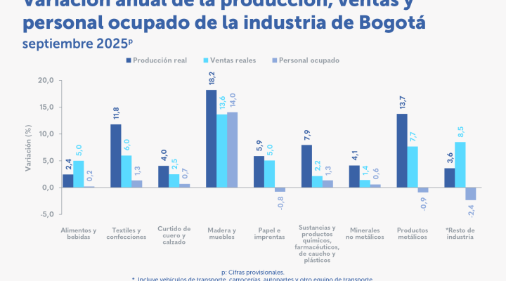 En septiembre de 2025, crecieron la producción, las ventas y el empleo de la industria en Bogotá Destacados: En septiembre de 2025, la producción real creció un 6,4 % en Bogotá. Las ventas reales de la industria