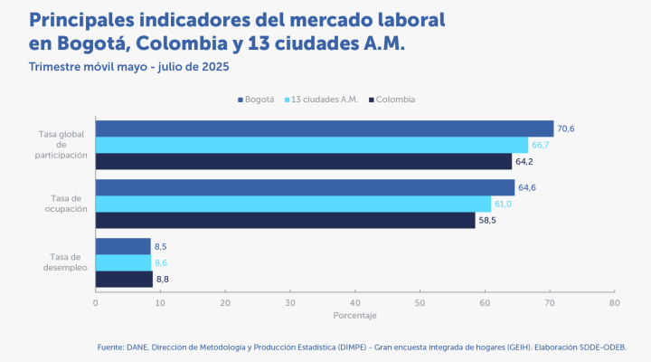 La tasa de desempleo en la capital disminuyó 1,5 puntos porcentuales en el período mayo – julio de 2025 Destacados: La población ocupada de Bogotá aumentó 44.234 personas durante el trimestre móvil mayo – junio de 2025 respecto al