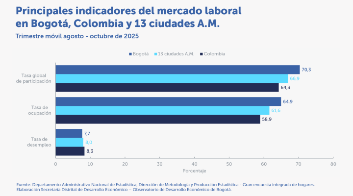 La tasa de desempleo de la capital fue la más baja desde 2007 Destacados: La población ocupada de Bogotá aumentó 107.212 personas durante el trimestre móvil agosto – octubre de 2025 respecto al