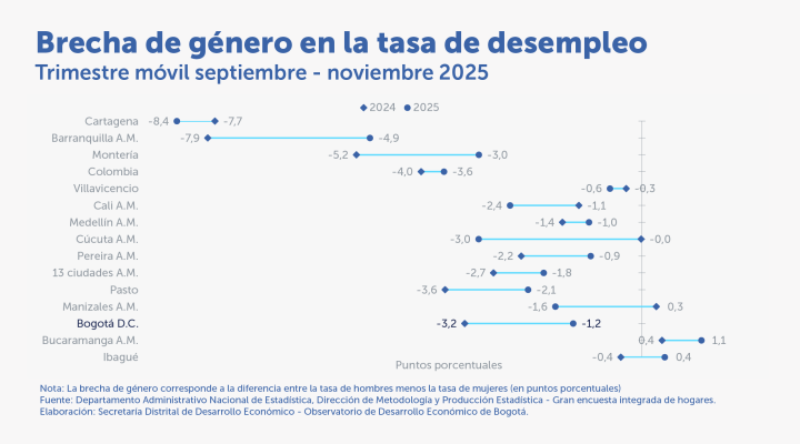 En el trimestre septiembre – noviembre de 2025, la tasa de desempleo de la mujeres fue las más baja delos últimos 8 años con un 7,6%.