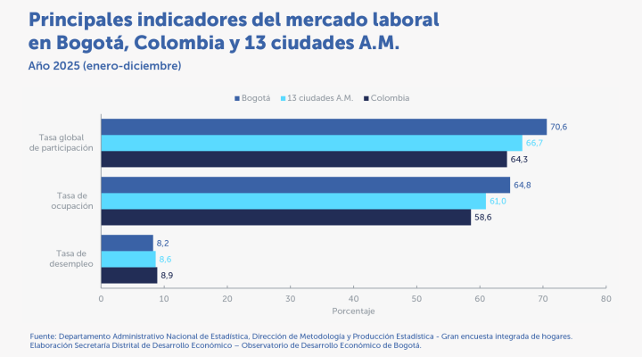 Bogotá cierra el año 2025 con la tasa de desempleo más baja desde 2007 Destacados: En 2025, la tasa de desempleo (TD) de Bogotá fue de 8,2 % y estuvo 0,7 puntos porcentuales (p.p.)