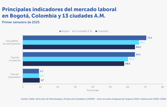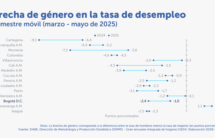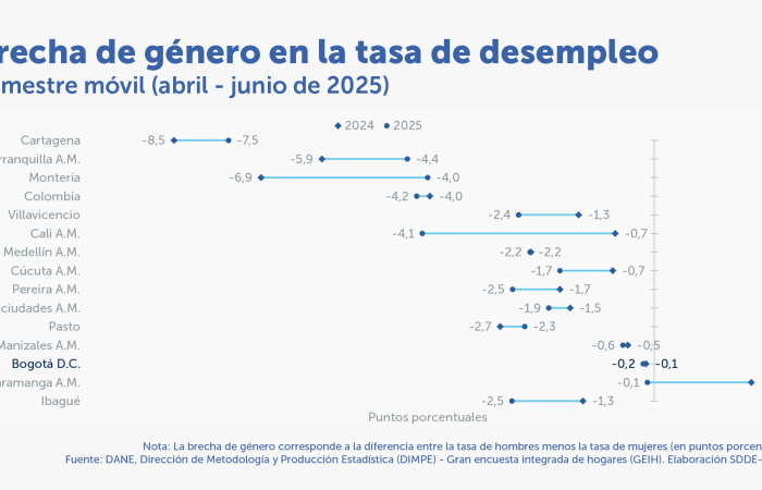 Tags Boletines 1 de agosto de 2025 La tasa de desempleo de Bogotá disminuyó -1,2 p.p. en el primer semestre de 2025.