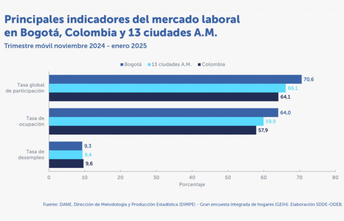La tasa de desempleo de Bogotá se ubicó en 9,3 % en el periodo noviembre 2024 – enero 2025, disminuyó un punto porcentual frente al año anterior.