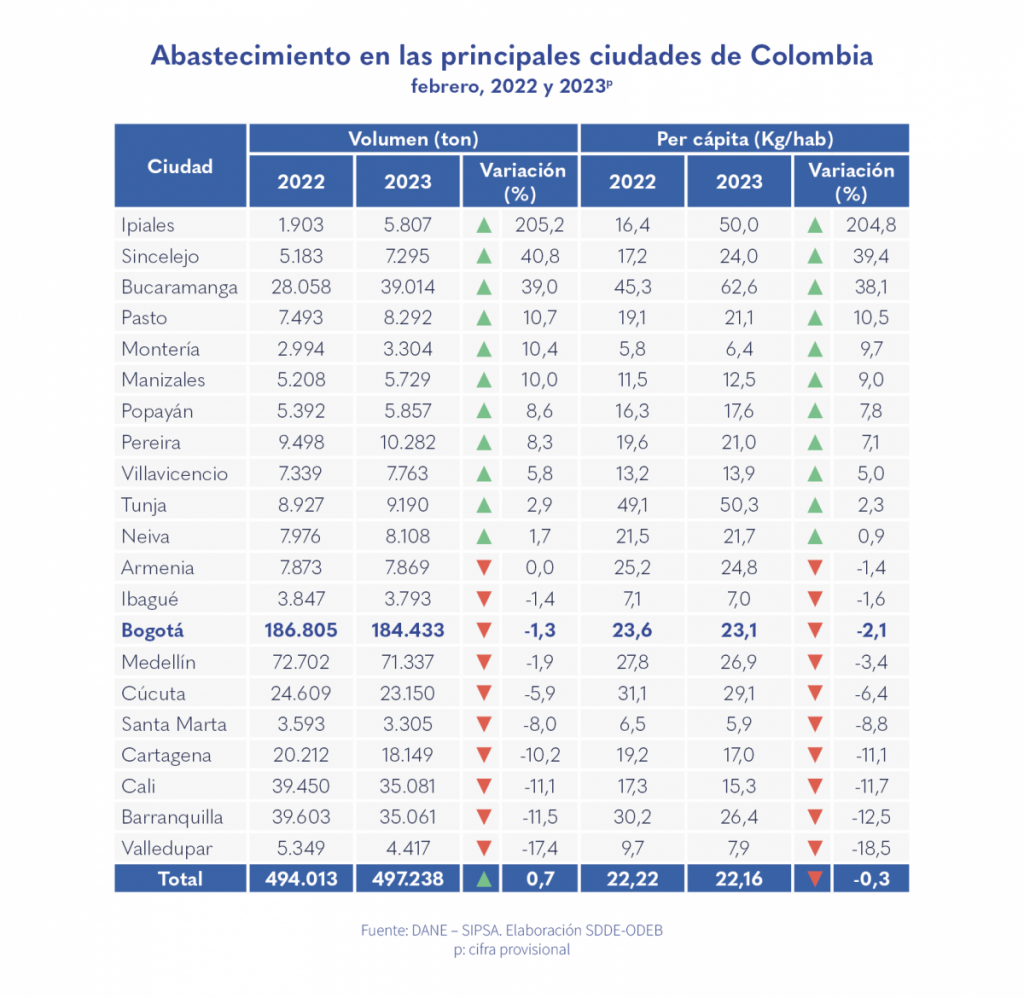 • En Bogotá el abastecimiento per cápita alcanzó 23,1 kilos por habitante (kg/hab) en febrero de 2023, representando un descenso de 2,1 % frente a febrero de 2022.