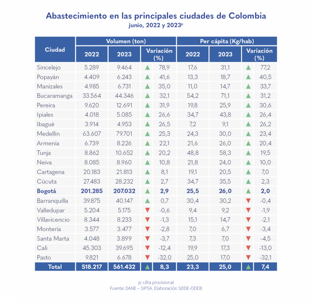 En junio de 2023, el abastecimiento per cápita alcanzó 26,0 kilogramos por habitante (kg/hab) en Bogotá, y subió 2,0 % frente a junio de 2022.