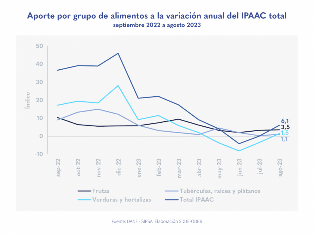 En agosto de 2023, el Índice de precios de alimentos agrícolas comercializados en Corabastos(IPAAC) aumentó 6,1 % respecto a agosto de 2022.