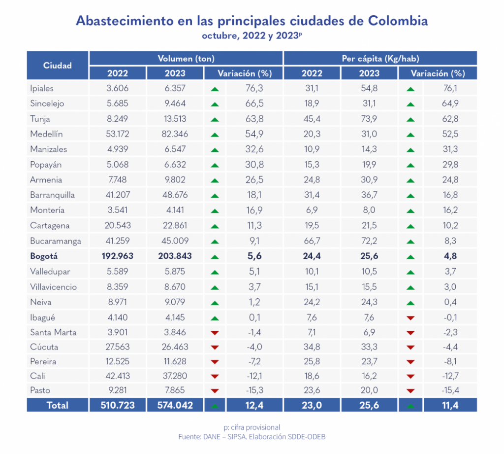En octubre de 2023, el abastecimiento per cápita alcanzó 25,6 kilogramos por habitante (kg/hab) en Bogotá, y aumentó 4,8 % frente a octubre de 2022.