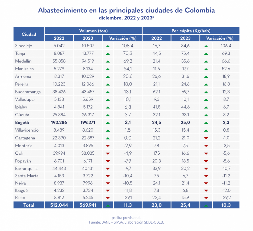 En diciembre de 2023, el abastecimiento per cápita alcanzó 25,0 kilogramos por habitante (kg/hab) en Bogotá, y aumentó 2,3 % frente a diciembre de 2022.