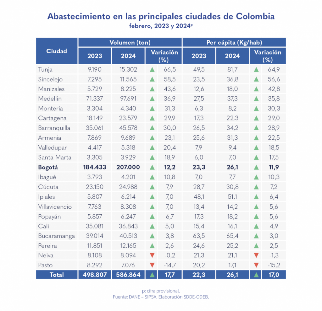 En febrero de 2024, el abastecimiento per cápita alcanzó 26,1 kilogramos por habitante (kg/hab) en Bogotá y aumentó 11,9 % frente a febrero de 2023.