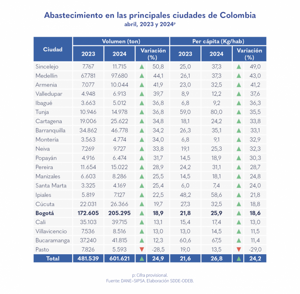 En abril de 2024, el abastecimiento per cápita alcanzó 25,9 kilogramos por habitante (kg/hab) en Bogotá y aumentó 18,6 % frente a abril de 2023.