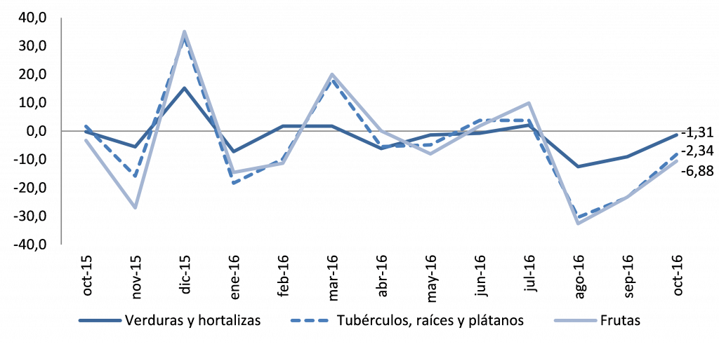 •  Durante el décimo mes del año el grupo de verduras y hortalizas fue el que más disminuyó su nivel de abastecimiento en 2.100 toneladas métricas, respecto a septiembre de 2016.