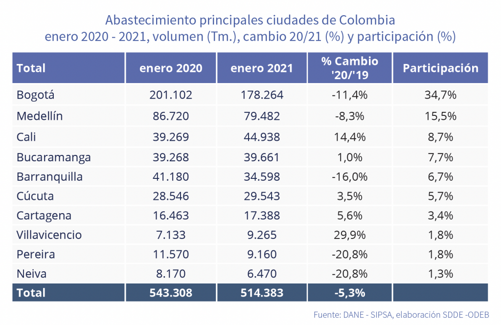 En enero, Bogotá representó el mayor mercado del país con un abastecimiento estable que alcanzó las 178.264 toneladas de alimentos