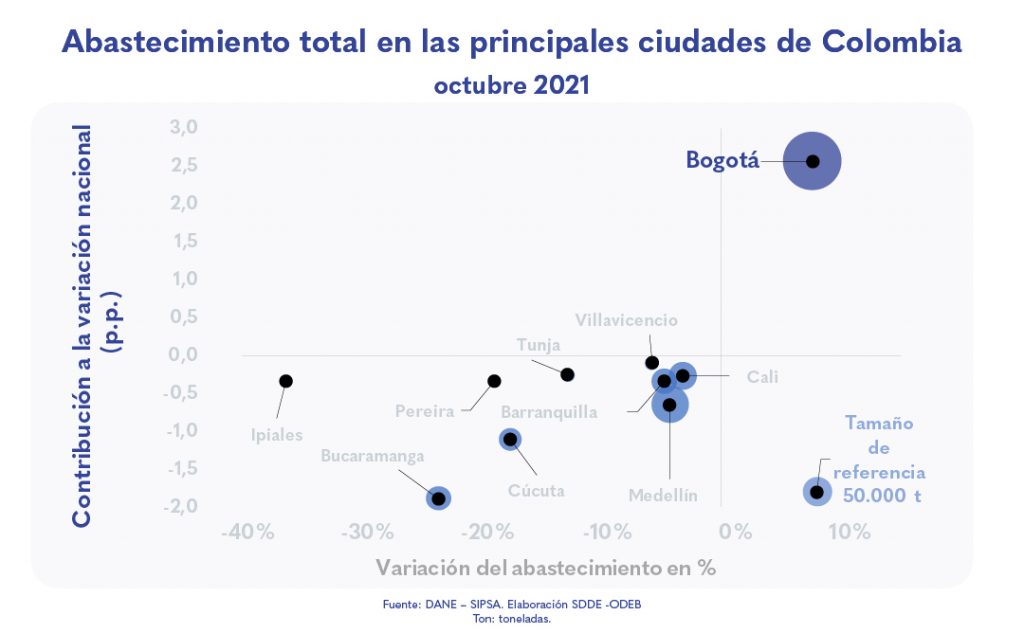 Published in: Boletines Bogotá es la ciudad con mayor contribución al crecimiento del abastecimiento alimentario del país Author Manuel Roberto Sánchez Rojas Published on: 3 de enero de 2022 Destacados: La capital fue la principal ciudad con mayor participación en el crecimiento del abastecimiento nacional con 2,6 p.p. El abastecimiento de la ciudad creció 7,6 % entre octubre 2021 y octubre de 2020.El grupo de verduras y hortalizas registró la mayor contribución al incremento mensual del abastecimiento de Bogotá con 3,6 p.p. El abastecimiento de cabezas de ganado porcino en el periodo enero – octubre de 2021, logró el 95,2 % del valor reportado en el mismo periodo de 2019.Entre septiembre y octubre cayó el precio del 56 % de las hortalizas y verduras. Archivo de descarga: Boletín ABASTECIMIENTO No.91 Temas: Abastecimiento. Tipo de Publicación: Boletines