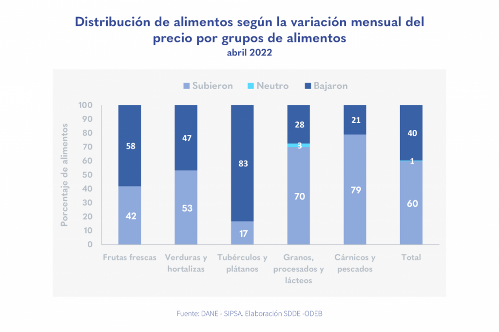 • Entre marzo y abril de 2022, el 60 % de los 184 alimentos monitoreados presentaron una tendencia de precios al alza.