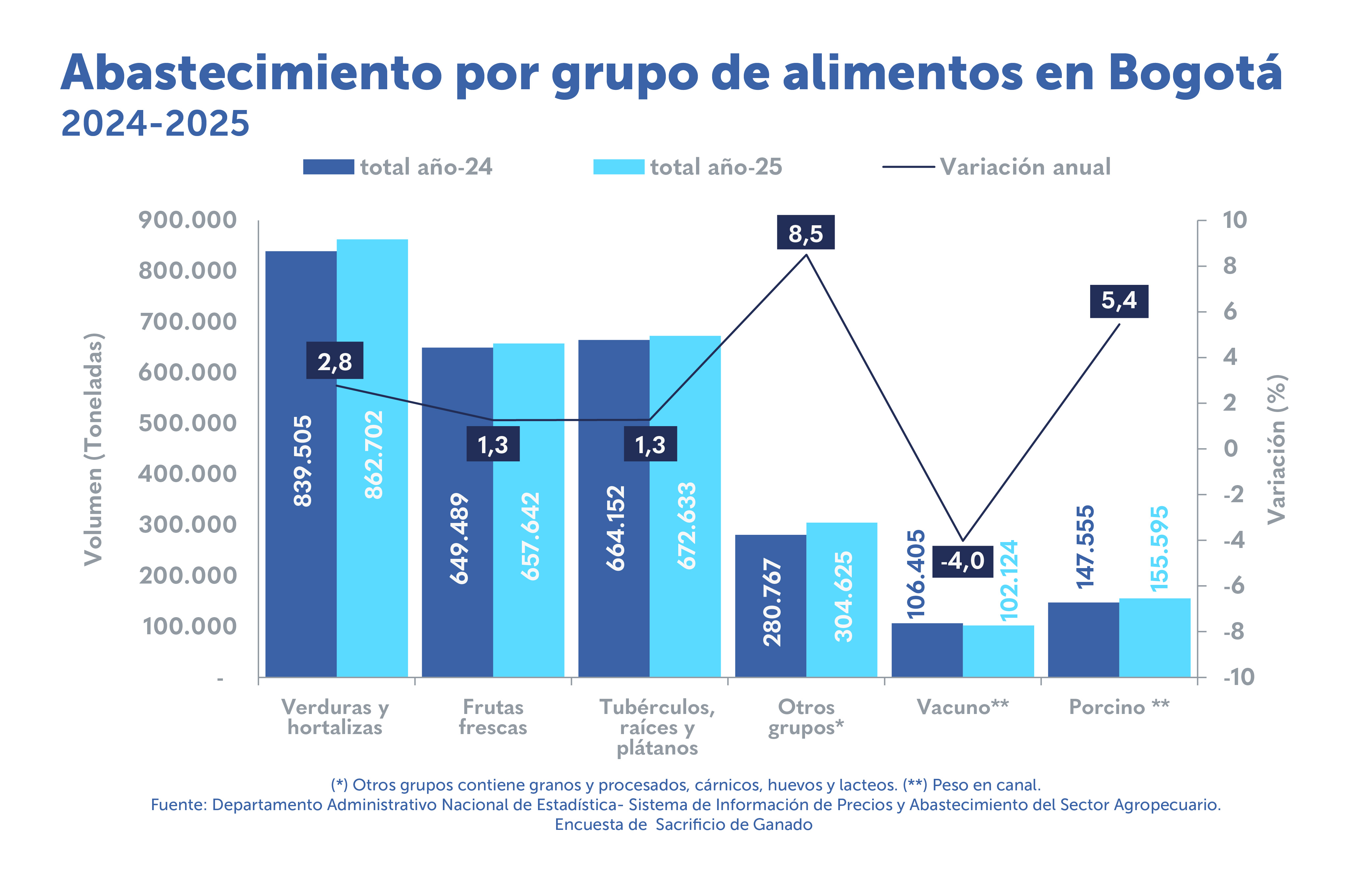 En 2025, el abastecimiento per cápita anual alcanzó 347,1 kilogramos por habitante (kg/hab) en Bogotá y aumentó 2,4% frente a 2024.