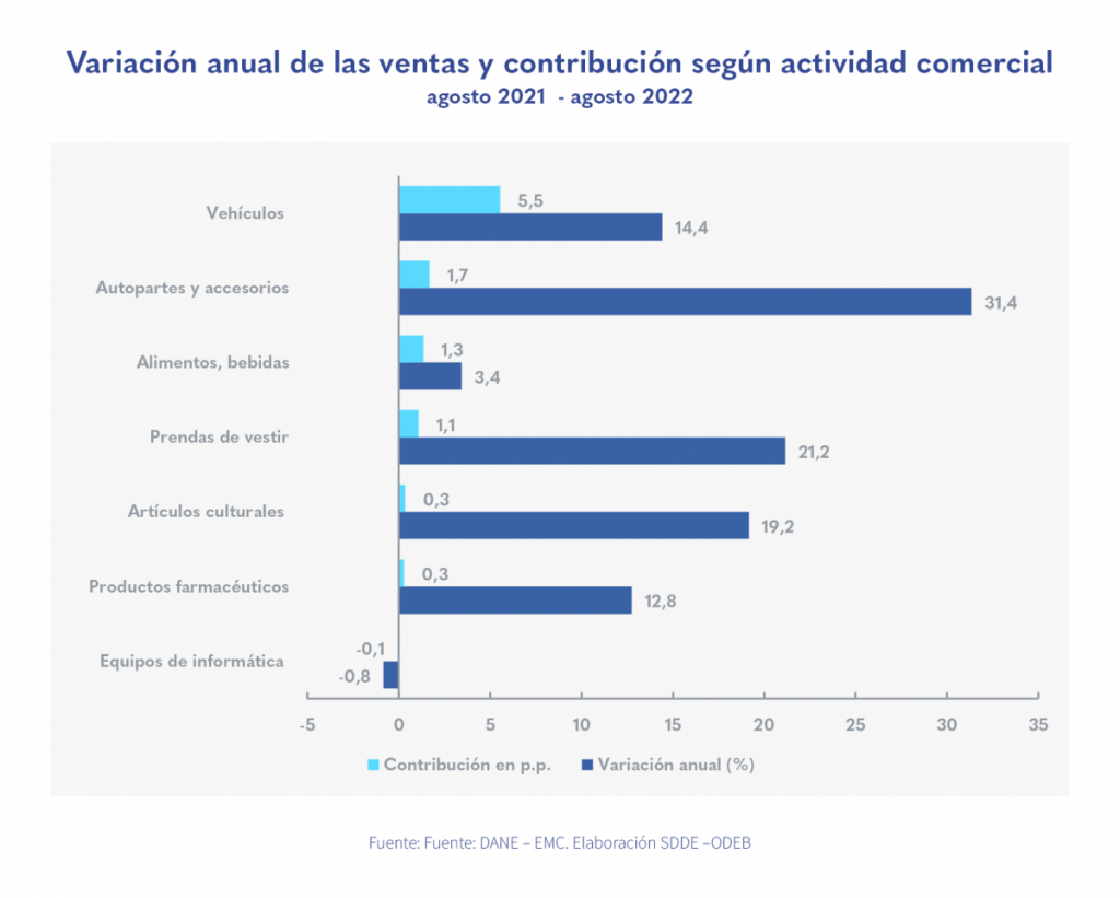 Bogotá fue el departamento que más contribuyó al crecimiento de las ventas reales a nivel nacional al aportar 3,3 puntos porcentuales (p.p.) al incremento de 10,2 % de las ventas reales del país.
