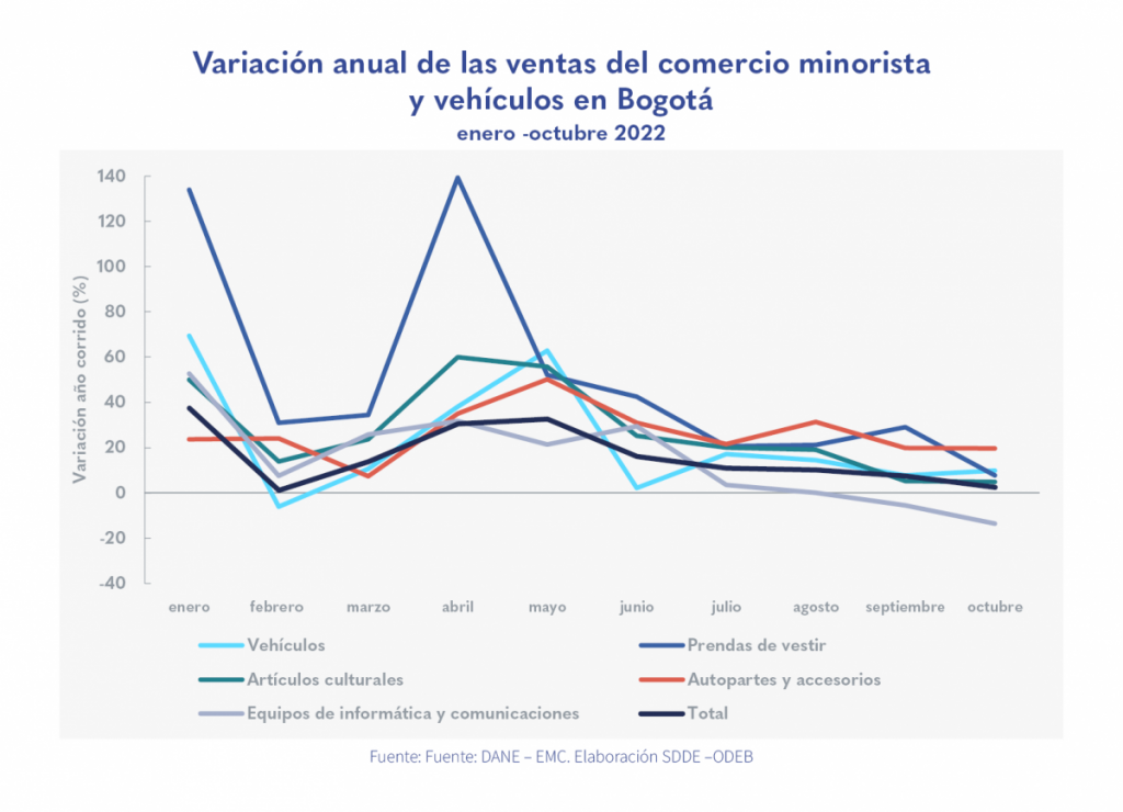 Bogotá fue el departamento que más contribuyó al crecimiento de las ventas reales a nivel nacional al aportar 0,8 puntos porcentuales (p.p.) al incremento de 1,7 % de las ventas reales del país.
