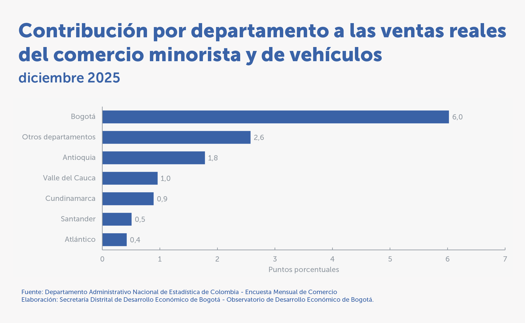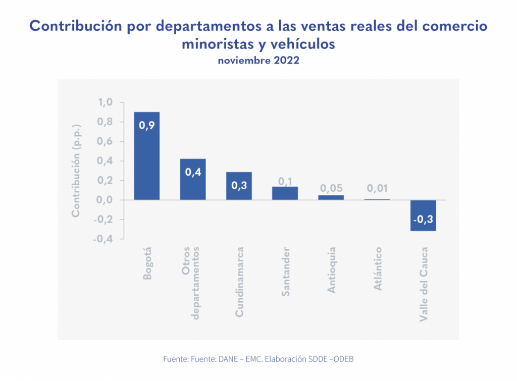 Bogotá contribuyó significativamente al crecimiento de las ventas reales a nivel nacional al aportar 0,9 puntos porcentuales (p.p.) al incremento de 1,5 % de las ventas reales del país.