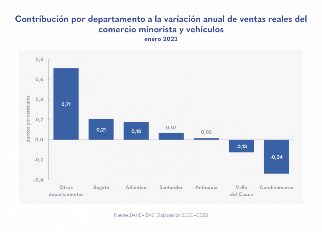 Published in: Boletines Personal ocupado en el sector minorista crece anualmente 2,7 % impulsado por las ventas de autopartes y prendas de vestir Author Observatorio Economico Published on: 29 de marzo de 2023 Destacados: Las ventas reales del comercio minorista y de vehículos en Bogotá aumentaron 0,7 % en enero de 2023. La división de autopartes y accesorios para vehículos impulsó el crecimiento anual de las ventas contribuyendo con 1,3 puntos porcentuales (p.p.). Para el mes de análisis, el comercio de alimentos, bebidas y tabaco fue el que más sumó al aumento del personal total, con un aporte de 0,9 p.p. Archivo de descarga: Boletín comercio al por menor No. 110 Temas:Comercio al por menor Tipo de Publicación: Boletines