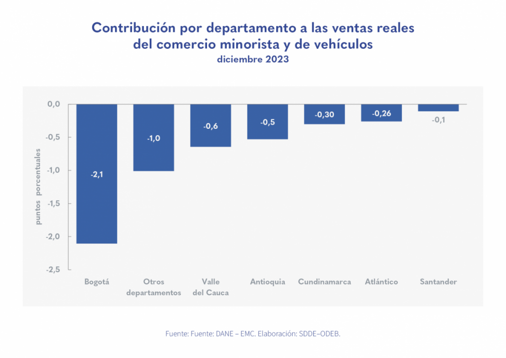 • Bogotá restó 2,1 puntos porcentuales (p.p.) a la variación anual de las ventas reales del comercio al por menor del país.