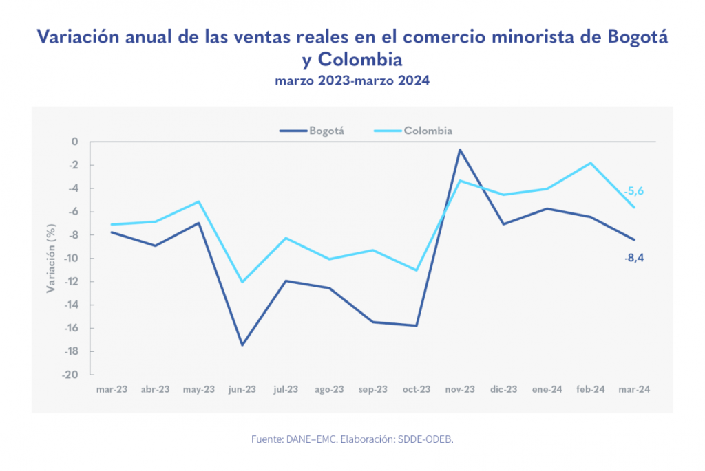 Bogotá restó 2,7 puntos porcentuales (p.p.) a la variación anual de las ventas reales del comercio al por menor del país.