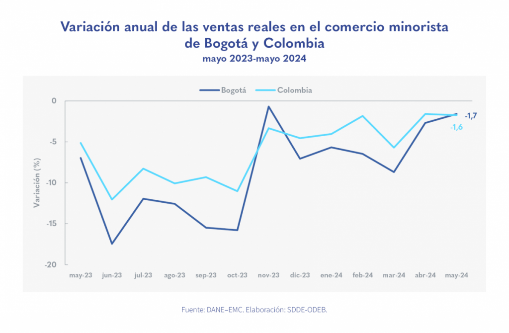 Bogotá restó 0,5 puntos porcentuales (p.p.) a la variación anual de las ventas reales del comercio al por menor del país.