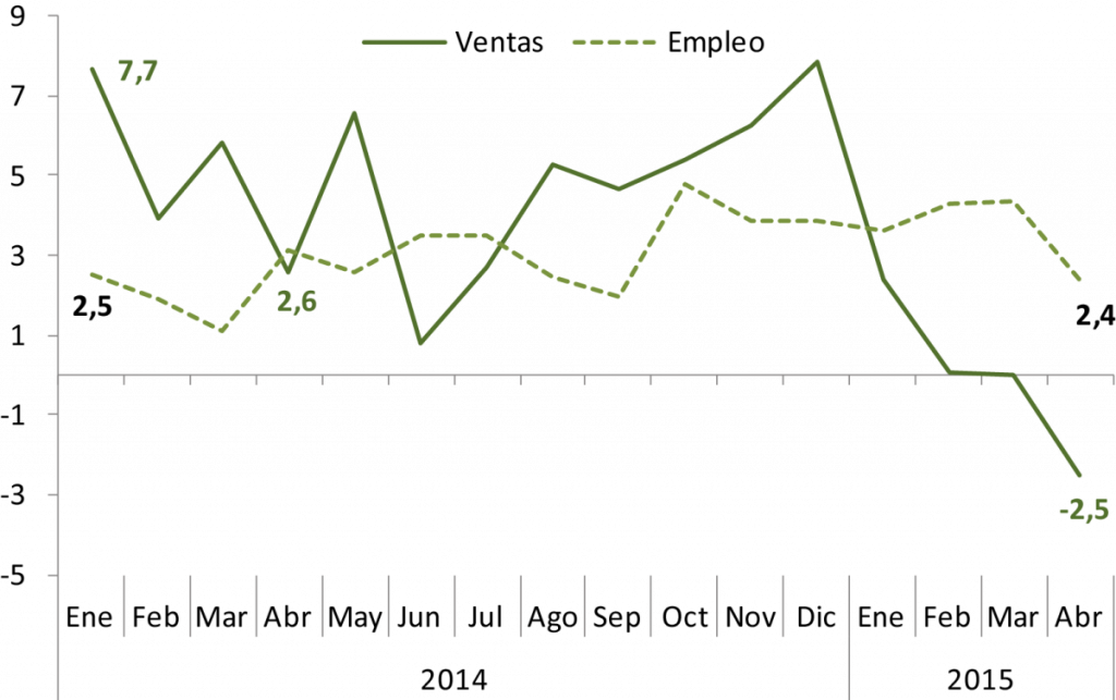 Bogotá representa cerca del 34% del mercado automotor colombiano En el país, la variación en las ventas del comercio minorista para abril fue -1%. Bucaramanga tuvo la caída más pronunciada entre las ciudades (-8%) La variación de las ventas del comercio sin combustibles en la capital se ubicó en 2,4%. En el cuarto mes del año, Bogotá incrementó 2,4% el empleo en el sector de comercio al por menor. La más alta variación se presentó en Cali (6,1%).
