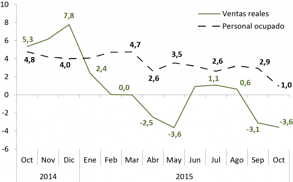 Bogotá representa el 32% de la venta de vehículos en el país, lo que constituye a la ciudad como el mercado más grande de este tipo de bienes durables. En el país, la variación en las ventas del comercio minorista para octubre fue 0,1%. Cali y Medellín fueron las únicas ciudades que presentaron variación positiva. La variación de las ventas reales en Bogotá, en el año corrido (enero-octubre) fue -0,8%. En Bogotá el personal ocupado se incrementó 1,0%, cifra que supera solamente la obtenida por Bucaramanga (0,3%).