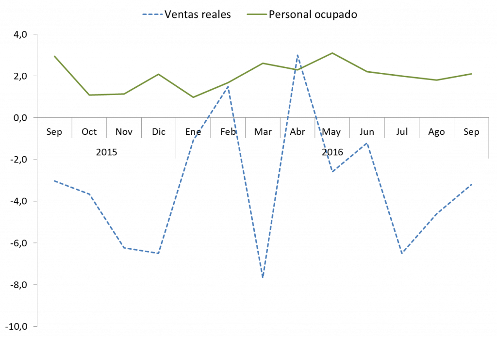 Las ventas reales de comercio minorista sin combustible presentaron una reducción de -2,9% año corrido a septiembre de 2016.