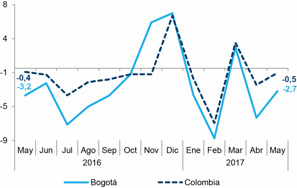 • Según los datos reportados por el DANE en la encuesta mensual de comercio al por menor las ventas reales del comercio minorista para Bogotá en el mes de mayo registraron una variación negativa de  2,7%