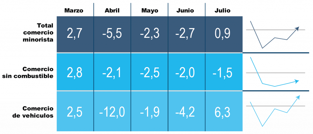 Published in: Boletines En julio la venta de vehículos jalona el Comercio al por Menor en Bogotá Author Observatorio Economico Published on: 26 de octubre de 2017 Destacados: El comercio minorista en el mes de julio presentó una variación positiva.Las ventas totales del comercio minorista en el mes de julio fueron jalonadas principalmente por la venta de vehículos.El personal ocupado para el comercio minoristas en la capital del país, presentó una variación de 2,3%. Archivo de descarga: Boletín comercio al por menor No. 46 Temas:Comercio al por menor Tipo de Publicación: Boletines